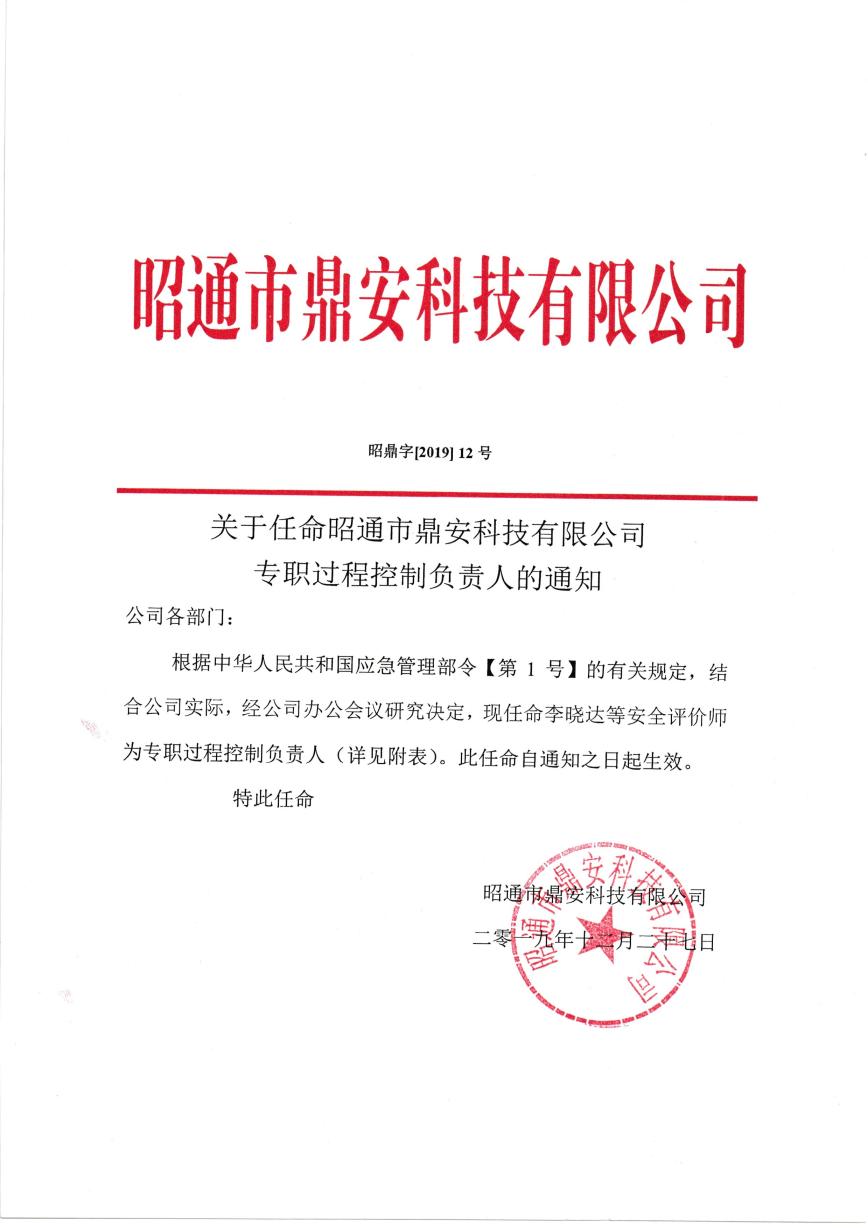 關(guān)于昭通市鼎安科技有限公司專職過程控制負(fù)責(zé)人的通知